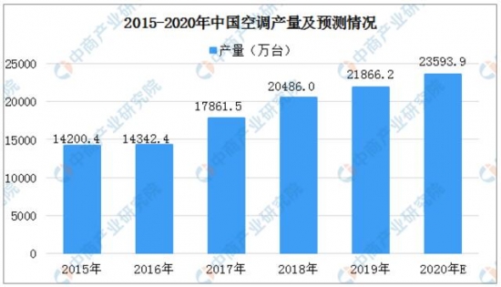 據(jù)國家統(tǒng)計局數(shù)據(jù)顯示:2019年我國空調總產量為21866.2萬臺,相比2018年提升6.74%。據(jù)中商產業(yè)研究院預測,2020年我國空調總產量將達23593.9萬臺。